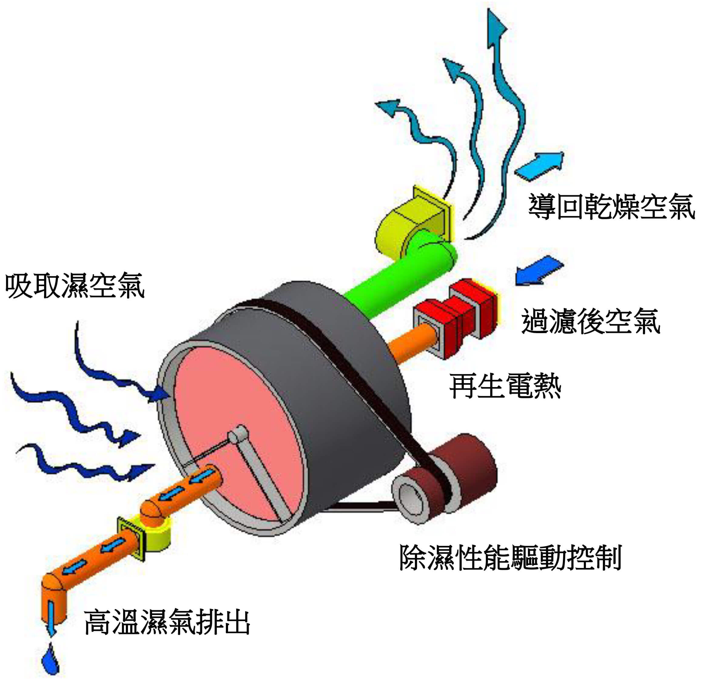 機體內與除濕輪旁通相連通,將乾燥後空氣抽入機體內,其轉動除濕輪將吸附高濕水分進行氣化及再生循環功能 |